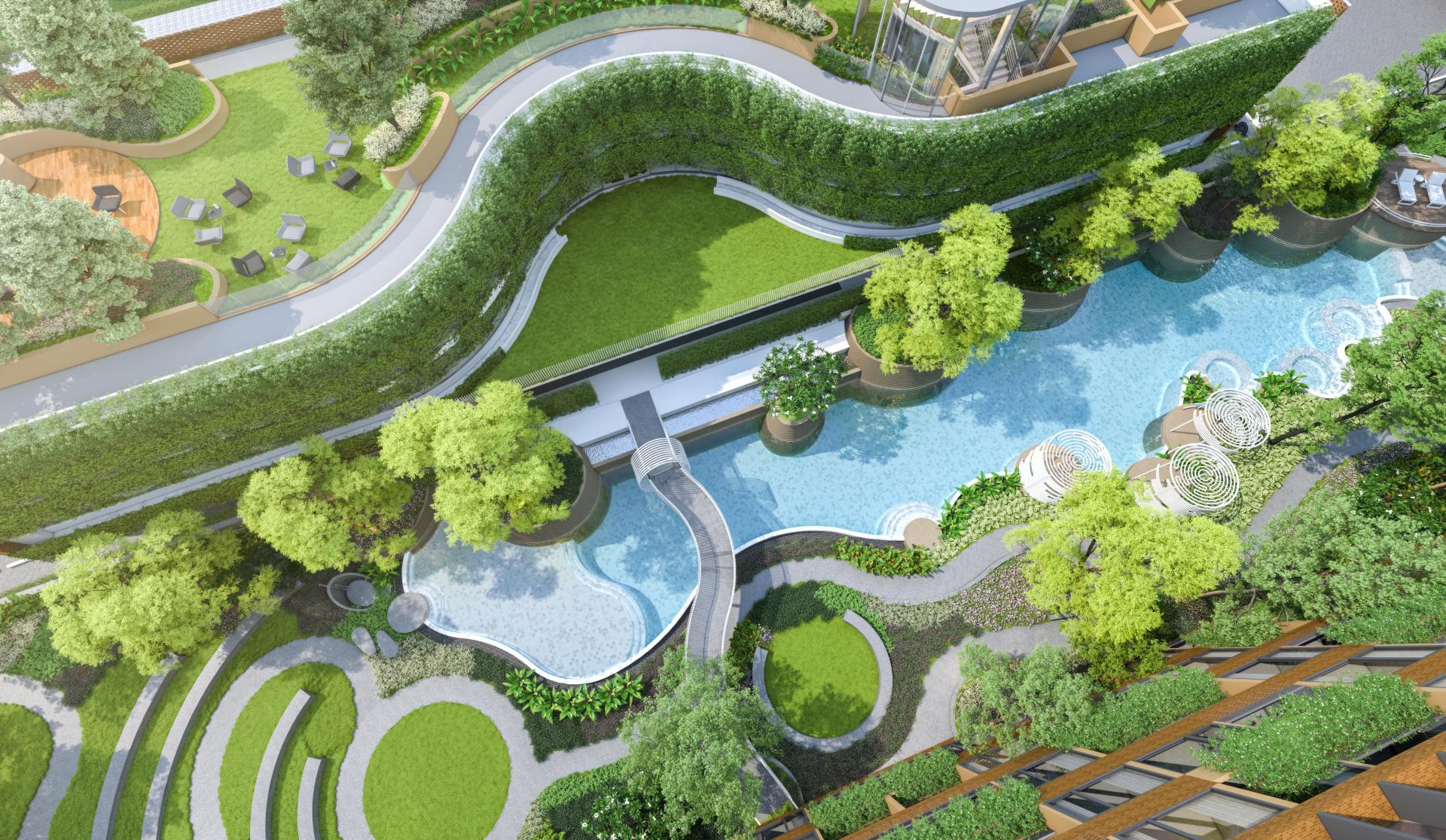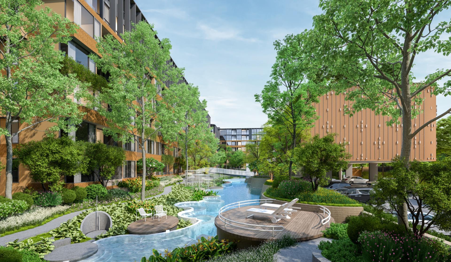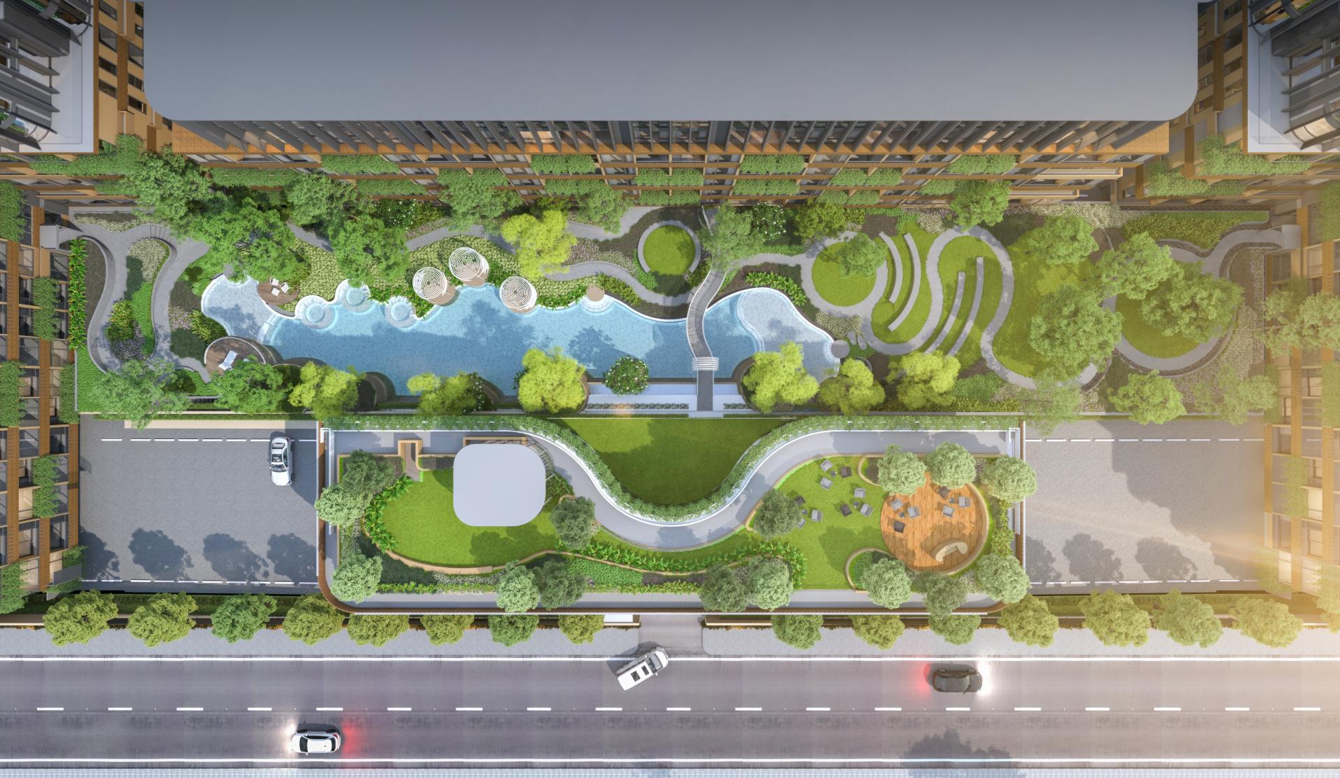 Arise Vibe 公寓由三栋七层高的建筑组成,通过绿意盎然的内庭院相连,庭院内设有公园和休闲区。